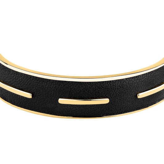 Особую изюминку браслету придают несколько горизонтальных вставок золотистого цвета, искусно расположенных на черной кожаной поверхности. Они добавляют блеск и роскошь, не делая изделие слишком вычурным. Геометрический дизайн вставок придает браслету современный и стильный вид.