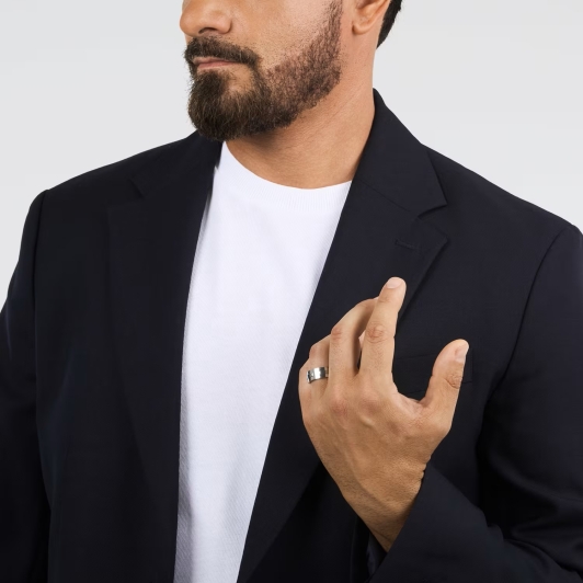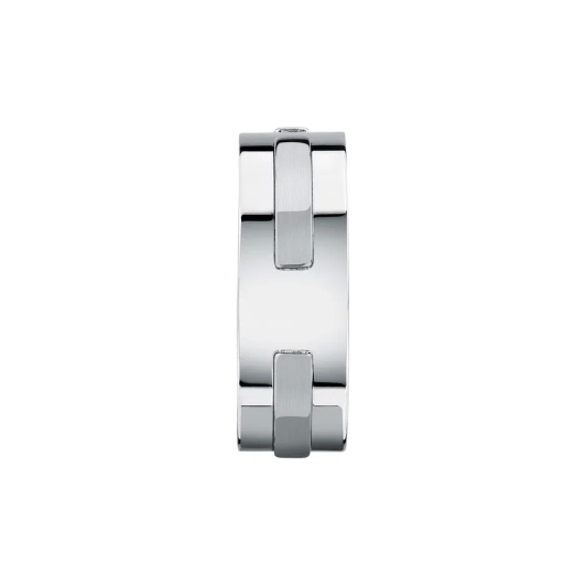 Широкий ободок кольца выполнен в эффектном серебряном цвете с глянцевой поверхностью, отражающей свет и притягивающей взгляды. Контраст глянца и матовых вставок создает выразительный и динамичный дизайн. Чередующиеся полосы матовой стали, расположенные по всей окружности кольца, придают ему глубину и объем.